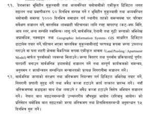 कार्यसूचीको बुँदा नम्बर ९१ मा भनिएको छ, “देशभरका भूमिहीन सुकुम्बासी तथा अव्यवस्थित बसोबासीको एकीकृत डिजिटल लगत सङ्कलन तथा प्रमाणीकरण ६० दिनभित्र सम्पन्न गर्ने । सार्वजनिक, ऐलानी तथा गुठी जग्गाको अभिलेख अद्यावधिक, नक्साङ्कन तथा ‘Geographic Information System- GIS’ आधारित डिजिटल डेटाबेस तयार गर्ने । जग्गा वितरण तथा पुनर्वास प्रक्रियालाई पूर्णतः पारदर्शी बनाउन सार्वजनिक ड्याशबोर्ड सञ्चालन गर्ने र सम्पूर्ण कार्यक्रमको समन्वय तथा अनुगमन प्रत्यक्ष निगरानीमा सञ्चालन गर्ने ।”